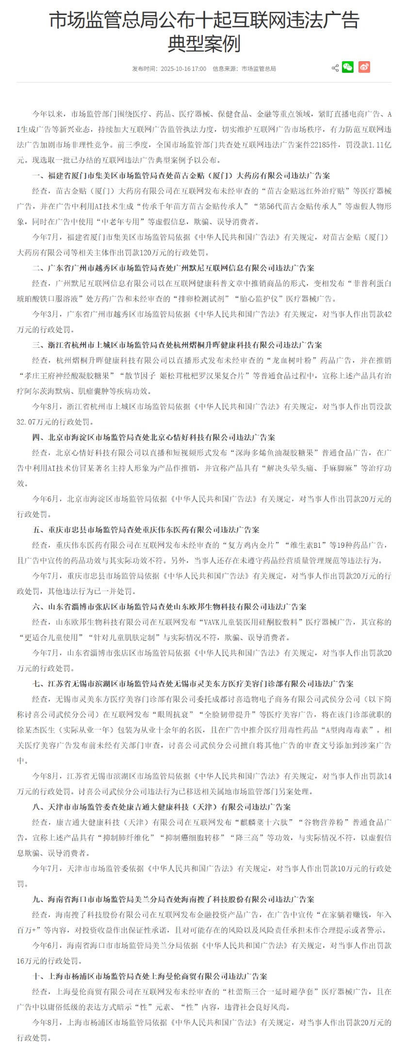 据市场监管总局消息,今年以来,市场监管部门围绕医疗、药品、医疗器械、保健食品、金融等重点领域,紧盯直播 电商广告、AI生成广告等新兴业态,持续加大互联网广告监管执法力度,切实维护互联网广告市场秩序,有力防范互 联网违法广告加剧市场非理性竞争。前三季度,全国市场监管部门共查处互联网违法广告案件22185件,罚没款1.11亿 元。现选取一批已办结的互联网违法广告典型案例予以公布。 市场监管总局公布十起互联网违法广告 曲型案例 发布时间:2025-10-16 17:00 信息来源:市场监管总局 今年以来,市场监管部门围绕医疗、药品、医疗器械、保健食品、金融等重点领域,紧盯直播电商广告、A I生成广告等新兴业态,持续加大互联网广告监管执法力度,切实维护互联网广告市场秩序,有力防范互联网违 法广告加剧市场非理性竞争。前三季度,全国市场监管部门共查处互联网违法广告案件22185件,罚没款1.11亿 元。现选取一批己办结的互联网违法广告典型案例予以公布。 一、福建省厦门市集美区市场监管局查处苗古金贴(厦门)大药房有限公司违法广告案 经查,苗古金贴(厦门)大药房有限公司在互联网发布未经审查的"苗古金贴远红外治疗贴"等医疗器械 ...