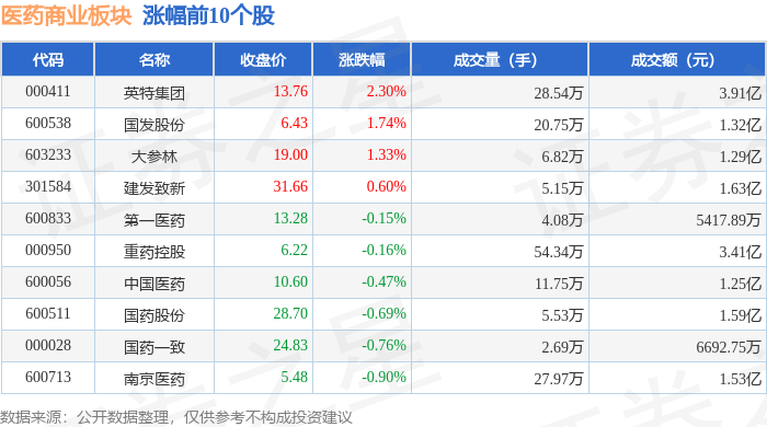 从资金流向上来看,当日医药商业板块主力资金净流出9.72亿元,游资资金净流入7722.04万元,散户资 金净流入8.95亿元。医药商业板块个股资金流向见下表: 证券之星消息,1月16日医药商业板块较上一交易日下跌2.34%,海王生物领跌。当日上证指数报收于 4101.91,下跌0.26%。深证成指报收于14281.08,下跌0.18%。医药商业板块个股涨跌见下表: | 代码 | 名称 | 收盘价 | 涨跌幅 | 成交量(手) | 成交额(元) | | | --- | --- | --- | --- | --- | --- | --- | | 000411 | 英特集团 | 13.76 | 2.30% | 28.54万 | | 3.91亿 | | 600538 | 国发股份 | 6.43 | 1.74% | 20.75万 | | 1.32亿 | | 603233 | 大参林 | 19.00 | 1.33% | 6.82万 | | 1.29亿 | | 301584 | 建发致新 | 31.66 | 0.60% | 5.15万 | | 1.63亿 | | 600833 | 第一医药 | 13.28 | -0.15% ...