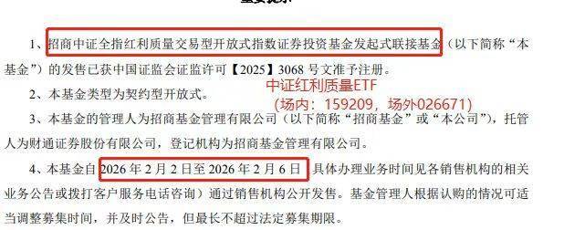 备受市场关注的首只中证红利质量ETF联接基金(基金代码:026671) 即将正式发售。据了解,中证 红利质量(159209)为2025年A股唯一涨幅超20%的红利类ETF。据官方公告,该基金由招商基金管 理,基金发售期为2026年2月2日至2026年2月6日。 据了解,该联接基金主要投资于场内交易的招商中证红利质量ETF(159209),为场外投资者提供了一 个便捷布局"红利质量"策略的工具。中证红利质量指数并非简单地筛选高股息率公司,而是通过盈利能 力、成长质量、财务稳健性等多维度综合评估,旨在选出既能持续分红又具备良好成长潜力的优质上市 公司,代表了红利策略从"高股息"向"高质量股息"的进阶。产品设计层面,该基金费用模式与场内保持 一致,采用"0.15%+0.05%"的全市场最低档 ,长期持有具备明显的成本优势;分红模式采用月度评估分 红机制,能更好地满足投资者的现金流需求,提升持有体验。 分析指出,在当前市场环境下,此类产品为追求稳健收益、注重长期价值的投资者提供了新的资产配置 选择。对于看好红利质量策略但不便直接交易ETF的投资者而言,此次发售的联接基金降低了参与门 槛,有助于引导更多资金关注上市公司 ...