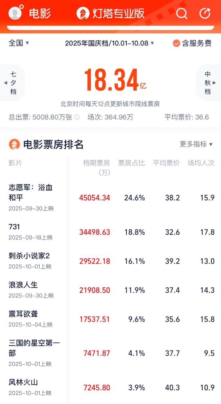 Group 1 - The National Day holiday film market saw a total box office of 18.34 billion yuan, with top films including "The Volunteer Army: Bloodbath for Peace," "731," and "Assassination Novelist 2" generating approximately 4.51 billion, 3.45 billion, and 2.95 billion yuan respectively [1][2][5] - The film market's success is attributed to the involvement of several listed companies such as China Film, Bona Film Group, Huayi Brothers, Wanda Film, and Light Media, which have seen their stock prices perform well this year [1][6][8] - The average ticket price during the National Day holiday was 36.6 yuan, a slight decrease from 40.4 yuan the previous year, indicating a trend towards more affordable viewing options [3][5] Group 2 - The National Day film lineup included over ten new releases across various genres, catering to diverse audience preferences, which helped maintain the momentum from the summer box office [2][3] - The film "731" significantly contributed to the box office in lower-tier cities, with these markets accounting for 23.7% of the total box office, a notable increase from the previous year [2][6] - The stock performance of film-related companies has been strong, with notable increases in share prices for companies like Happiness Blue Sea, Light Media, and Huanrui Century, which saw year-to-date gains of 149.43%, 107.48%, and 101.23% respectively [6][8] Group 3 - The film industry is evolving towards a more rational and mature market, as evidenced by the close box office performance of top films during the National Day holiday, suggesting a balanced competition among major titles [3][6] - Companies are exploring diversified revenue streams beyond traditional box office sales, including collaborations with tourism and dining sectors, as seen with themed pop-up stores and merchandise sales related to films [7][8] - Predictions for 2025 indicate that major companies like Light Media, Shanghai Film, and China Film are expected to see their net profits double, driven by upcoming blockbuster releases [8]