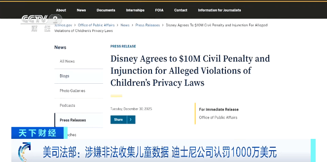 (央视财经《天下财经》)当地时间30日,美国司法部发布声明称,联邦法院已批准一项和解协议,迪 士尼公司同意支付1000万美元的罚款,以了结旗下两家公司涉嫌非法收集儿童用户数据的诉讼。 根据美国司法部向加州中区联邦地区法院提交的诉状,迪士尼公司旗下两家公司被指控向视频网站优兔 提供的部分视频,未按规定标注"供儿童"观看,从而得以收集在优兔网站收看相关内容的13岁以下儿童 的个人数据,并利用这些数据投放定向广告。美国相关法律规定,各类面向13岁以下儿童的网站、应用 程序和其他在线服务有必要把收集到的个人信息通知儿童父母,并在收集信息前获得可验证的家长许 可。 美国联邦贸易委员会此前对迪士尼公司提起诉讼,称其行为违反《儿童在线隐私保护法》。今年9月 份,迪士尼与该委员会达成和解协议,同意支付1000万美元罚款。该委员会随后按程序将和解协议、调 查记录、合规计划等移交司法部,由司法部提起诉讼并推进法院判决。 转载请注明央视财经 编辑:令文芳 美国司法部表示,联邦法院判决迪士尼公司支付1000万美元的民事罚款,同时禁止迪士尼以任何违反 《儿童在线隐私保护法》的方式在优兔平台运营,并须建立一套合规计划,确保其今后在相关平 ...