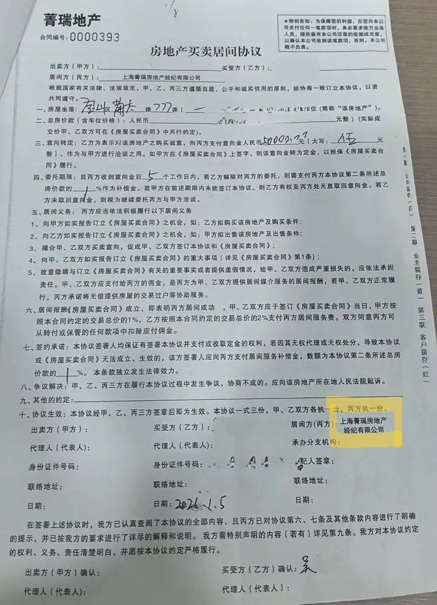 支付5万元购房意向金,最后决定不买,这笔钱竟被中介以"带看服务"为由强行截留三成。近日,上海市民吴女士向"新民帮侬 忙"反映其与菁瑞地产间的购房纠纷:在《房地产买卖居间协议》仅有买方单方签字、交易根本未成立的情况下,中介不仅拒绝 全额退还意向金,更在事后主张"劳动成本",将意向金5万元款项扣留1.5万元。法律人士指出,中介的核心报酬以促成交易为前 提,仅提供带看等基础服务却单方设定高额扣费,缺乏法律依据。 没有卖家签字 吴女士告诉记者,1个月前,她通过菁瑞地产看房,准备在宝山顾村购买一套二手房。1月5日,她向菁瑞地产相关负责人打款5 万元,这笔款项为宝山区菊太路777弄一套房屋(以下简称"A房源")的购房意向金。同天,吴女士还签订了一份《房地产买卖 居间协议》,合同显示,居间方为上海菁瑞房地产经纪有限公司。根据条款,若A房源出卖方在《房屋买卖合同》上签字,则上 述意向金转为定金,未约定"带看费是否从意向金中扣除"。值得一提的是,A房源的《房屋买卖合同》、《居间协议》中,仅有 吴女士一人签字,出卖方未签字。 《房地产买卖居间协议》中,没有出卖方签字,仅有吴女士的签字。受访者供图 吴女士收到的意向金收条 "之前只 ...