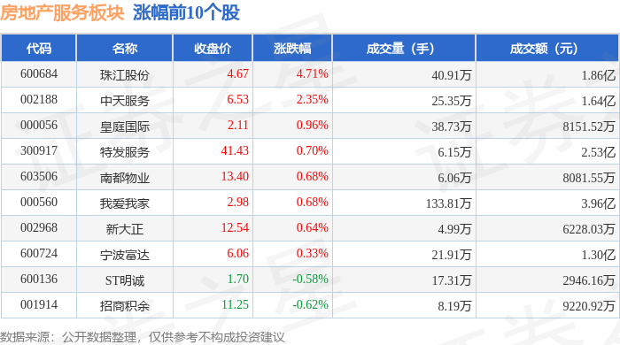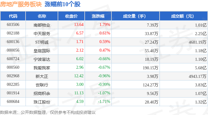 证券之星消息,1月13日房地产服务板块较上一交易日下跌0.75%,特发服务领跌。当日上证指数报收于 4138.76,下跌0.64%。深证成指报收于14169.4,下跌1.37%。房地产服务板块个股涨跌见下表: | 代码 | 名称 | 收盘价 | 涨跌幅 | 成交量(手) | 成交额(元) | | --- | --- | --- | --- | --- | --- | | 603506 | 南都物业 | 13.64 | 1.79% | 7.39万 | 1.01亿 | | 002188 | 中天服务 | 6.57 | 0.61% | 33.87万 | 2.25亿 | | 600136 | ST明诚 | 1.71 | 0.59% | 27.24万 | 4681.19万 | | 000056 | 皇庭国际 | 2.12 | 0.47% | 55.40万 | 1.18亿 | | 600724 | 宁波富达 | 6.02 | -0.66% | 18.19万 | 1.10亿 | | 000560 | 我爱我家 | 2.96 | -0.67% | 190.15万 | 5.68亿 | | 002968 | 新大正 | 12.4 ...