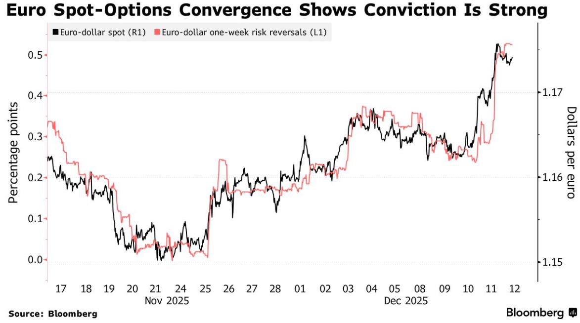 据存款信托和清算公司(DTCC)的统计数据显示,本月交易最活跃的行权价位于每欧元 1.18 美元,其中基础价值的绝大部分集中在 12 月 18 日至 19 日(欧 洲央行利率决议窗口期)到期的合约。这些资金流向表明,到决策者完成会议时,欧元汇率将交投于该水平之上。 据熟悉资金流向的外汇交易员透露,对冲基金是本周欧元看涨价格走势的主要推动者,他们抢购了普通和奇异期权,这些期权将在欧元走强时获利。 本周美联储连续第三次降息,以及欧洲央行执行委员会委员伊莎贝尔·施纳贝尔的鹰派言论之后,欧元徘徊在两个多月高点附近。目前,针对欧洲央行 12 月 18 日决议的期权情绪是近三个月来最看涨的。 智通财经APP注意到,期权交易员预计,鉴于下周欧洲央行公布的利率决议预计将凸显其与美联储的政策分歧,欧元的涨势将在下周获得新的动力。 在决议公布前买入波动性的成本是三个月来最昂贵的,交易员将此归因于施纳贝尔的言论。即使欧洲央行明年不加息,摩根士丹利的策略师们仍然预计,到 2026 年第二季度,欧元将升至 1.30 美元。 ...