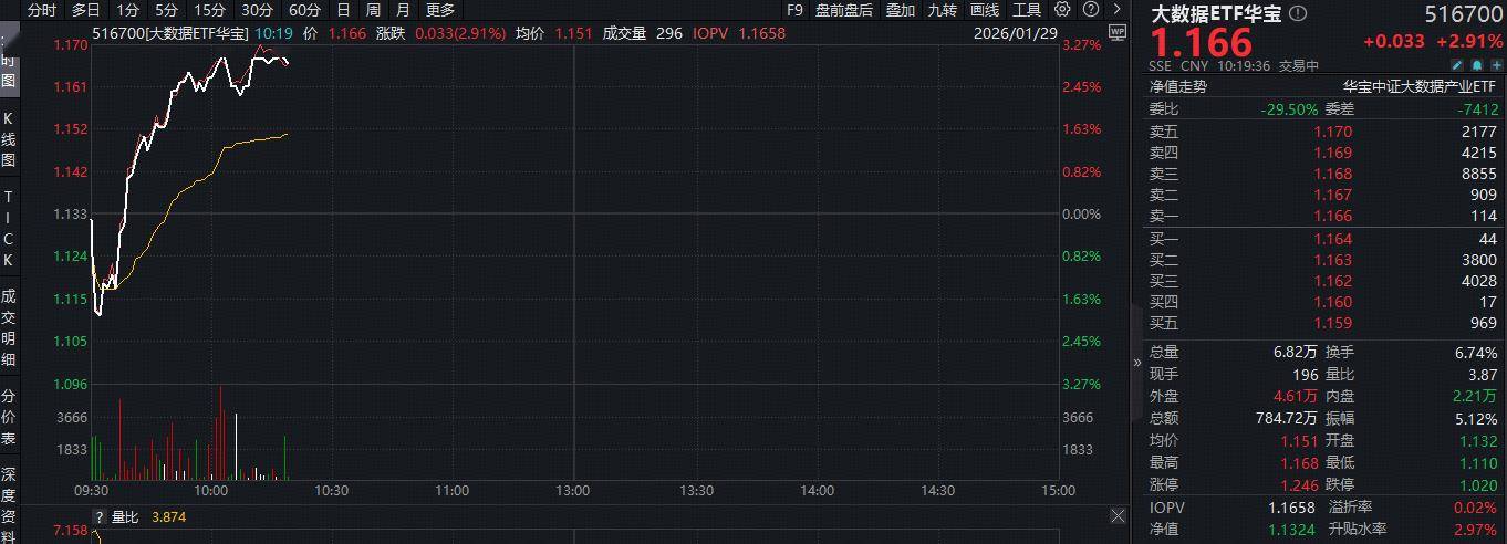 消息面上,亚马逊云科技(AWS)近日上调其EC2机器学习容量块价格约15%。此外,Google Cloud 官方邮件通知,将从今年5月起,对数据传输价格进行 调整,其中北美地区翻倍。 业内人士指出,AWS和谷歌打响云涨价第一枪,国产云厂商有望跟进。云涨价的背后逻辑在于近期由于CPU及存储涨价,以及Agent的复杂任务执行带来算 力需求的激增。 华鑫证券指出,数据中心是AI的核心基础设施。海内外算力市场高景气度推动IDC行业稳步增长。招商证券指出,需求侧方面,算力驱动数据中心建设热 潮,带动产业链公司订单显著增长。北美、中国为核心增量区域,海外龙头仍有大量待建项目,国内受算力卡进口受限影响暂缓后,有望迎来需求反弹。 数据显示,截至2025年底,大数据ETF华宝(516700)标的指数中,算力概念权重占比达40.91%,AI应用概念权重占比达37.43%。 今日(1月29日)重点布局算力、AI应用领域的大数据ETF华宝(516700)涨势如虹,场内价格盘中大涨超3%,现涨2.91%。成份股方面,科大讯飞涨停, 易点天下涨超11%,天下秀、托尔思涨逾7%,用友网络、鼎捷数智、税友股份等个股大幅跟涨。 【数据安全为王 ...