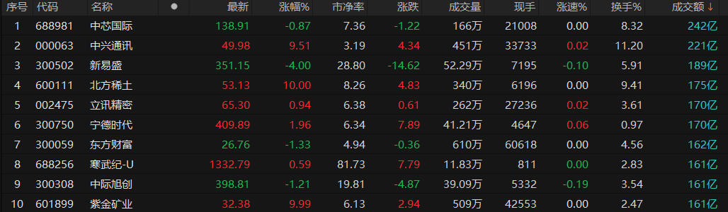 沪指高开高走突破3900点整数大关,刷新2015年8月以来新高。创业板指和科创50指数冲高回落。截至收盘,沪指涨1.32%站稳3900点,深成指涨 1.46%,创业板指涨0.73%。 盘面上,市场热点轮番活跃,全市场共有99只个股涨停。从板块来看,有色金属、核电板块上演涨停潮。 核电板块表现活跃,合锻智能8天4板,永鼎股份、安泰科技等十余股涨停。 有色金属板块全天走强,精艺股份6天5板,江西铜业、河钢资源、白银有色等十余股涨停。 下跌方面,影视院线概念股集体大跌,中国电影等股跌停。 沪深两市成交额2.65万亿元,较上一个交易日放量4718亿。 个股方面,中芯国际、中兴通讯成交额在200亿元之上。 | 序号 代码 - 名称 | | | ● ● ■ ■ 最新 品 品 品 市 > | | | 张跌 | | | 换手% 成交额↓ | | --- | --- | --- | --- | --- | --- | --- | --- | --- | --- | | 1 688981 | 中村国际 | 138.91 | -0.87 | 7.36 | -1.22 | 166万 | 21008 | 0.00 | 8.32 242 ...