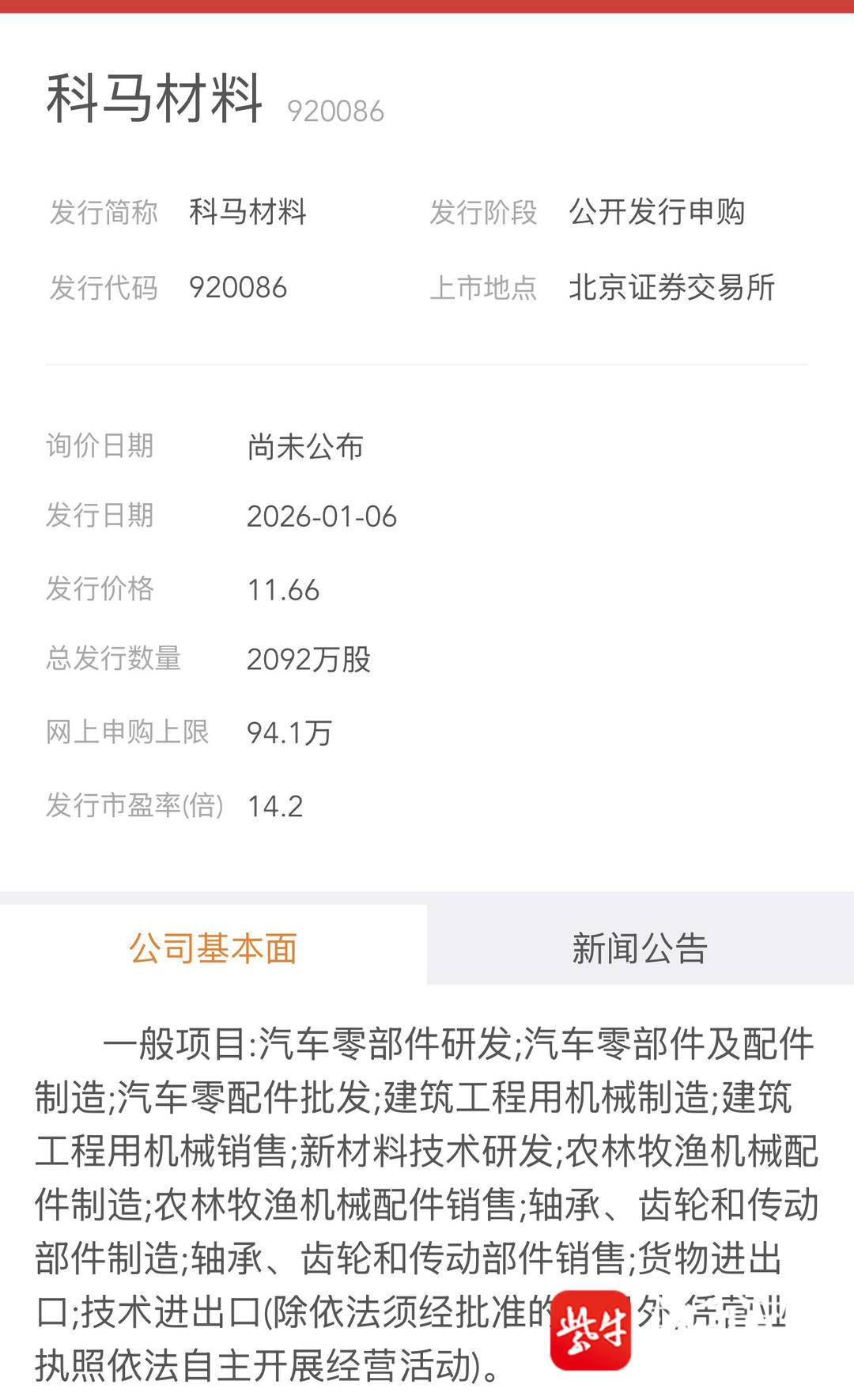科马材料 920086 发行市盈率(倍) 14.2 公司基本面 新闻公告 般项目:汽车零部件研发;汽车零部件及配件 制造;汽车零配件批发;建筑工程用机械制造;建筑 工程用机械销售;新材料技术研发;农林牧渔机械配 晚报网1月4日讯(记者范晓林薄云峰)本有2只新股申购,这将是2026年A股首批新股。从目程安排上,两只新股均在1月6日申购,分别是北交所新股 沪市主板新股至信股份(603352) | 发行代码 920086 | 上市地点 北京证券交易所 | | --- | --- | | 发行简称 科马材料 | 发行阶段 公开发行申购 | 询价日期 尚未公布 发行日期 2026-01-06 发行价格 11.66 总发行数量 2092万股 网上申购上限 94.1万 科马材料是国内汽车摩擦片"小巨人"企业。科马材料的发行价为11.66元/股,发行市盈率为14.2倍。 科马材料是工信部专精特新"小巨人"企业、浙江省"隐形冠军"企业,主营业务为干式摩擦片及湿式纸基摩擦片的研发、生产及销售,并致力于新型摩擦材 料的开发应用。 公司深耕传动摩擦材料行业二十余年,客户包括采埃孚(嘉兴)、法士特伊顿、福达股份(603166)、浙江奇 ...