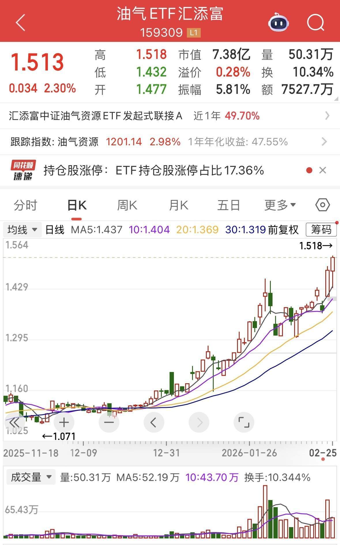 地缘局势推动油价大涨,油气ETF汇添富(159309)涨超2%再创新高,昨日吸金超7200万,今日盘中再获净申购4800万!