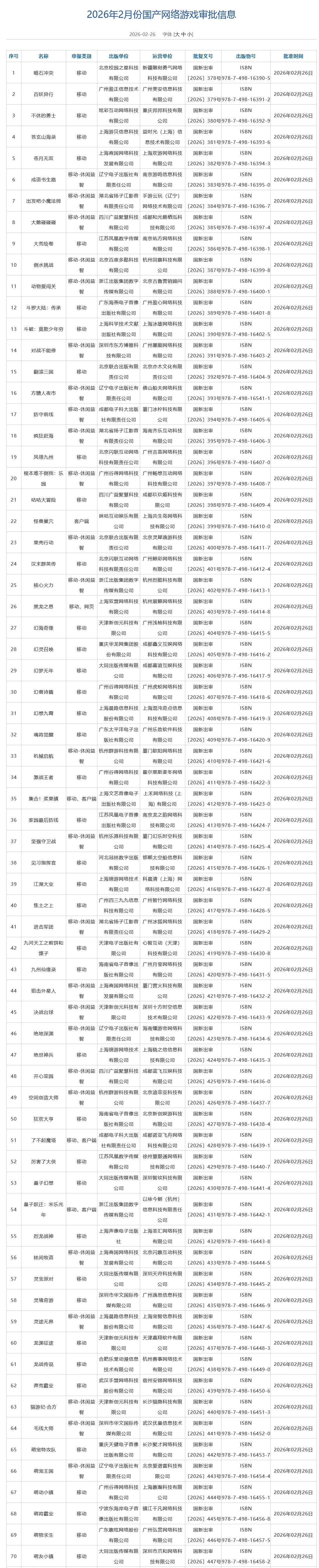 智通财经APP获悉,近日,国家新闻出版署发布2026年2月份国产网络游戏审批信息,2月共146款游戏获批。其中包括中青宝(300052.SZ)的《喧天纪》等游 戏。 | 126 | 妖兽来了 | 移动 | MUNIA | XI4JD:FMVF=717 121 | 出口 166 | AInci | 2026年02月26日 | | --- | --- | --- | --- | --- | --- | --- | --- | | | | | 有限公司 | 有限公司 | 〔2026〕 503号978-7-498-16514-5 | | | | 127 | 配对大师 | 移动-休闲益 | 湖北省扬子江影音 | 武汉欢乐泡泡信息 | 国新出审 | ISBN | 2026年02月26日 | | | | 智 | 有限责任公司 | 技术有限公司 | 〔2026〕 504号978-7-498-16515-2 | | | | 128 | 蚁族大冒险 | 移动 | 上海易娱网络科技 | 上海易娱网络科技 | 国新出审 | ISBN | 2026年02月26日 | | | | | 有限公司 | 有限公司 | 〔2026〕 505号9 ...