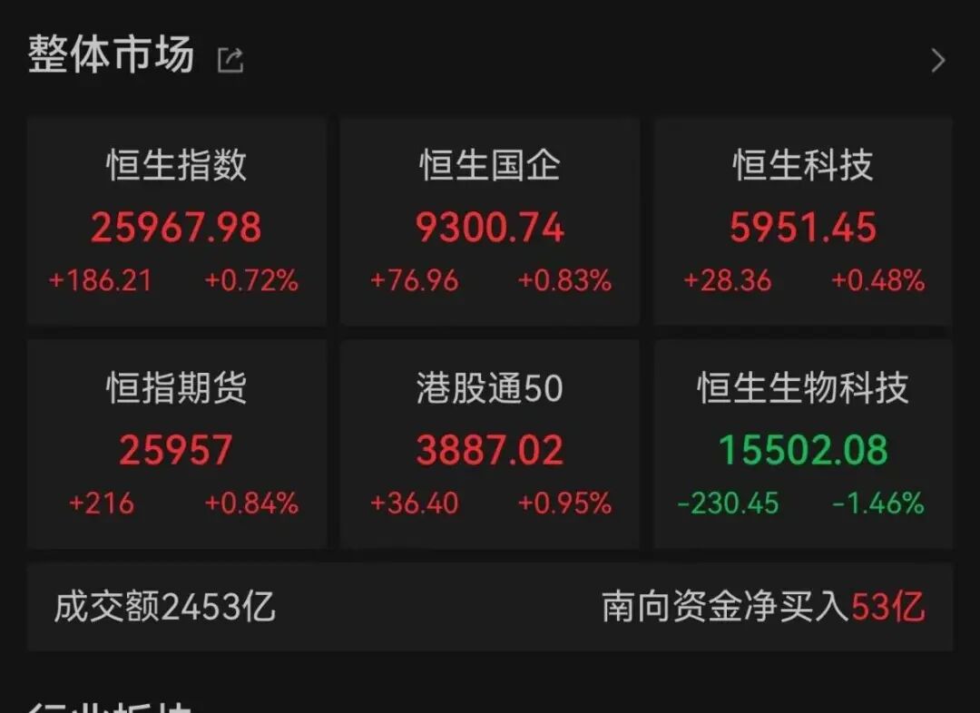 【导读】港股三大指数今日集体收涨 中国基金报记者 储是 港股今日午后涨幅扩大,三大指数集体收涨。石油、银行等红利板块上涨,医药股继续下 跌。 据商务部消息,中美双方将就中美经贸关系中的重要问题进行磋商。 港股全天震荡 午后发力 10月23日,港股三大指数全天震荡,午后发力,涨幅扩大。 截至收盘,恒生指数上涨0.72%,恒生科技指数上涨0.48%,恒生中国企业指数上涨 0.83%。 盘面上,石油股走强,内银股继续拉升,医药股延续下跌。个股方面,泡泡玛特重挫超9%, 美团盘中涨超6%。 盘中,根据商务部的消息,经中美双方商定,中共中央政治局委员、国务院副总理何立峰将 于10月24日至27日率团赴马来西亚与美方举行经贸磋商。双方将按照今年以来两国元首历次 通话重要共识,就中美经贸关系中的重要问题进行磋商。 整体市场 它 | 恒生指数 | 恒生国企 | 恒生科技 | | --- | --- | --- | | 25967.98 | 9300.74 | 5951.45 | | +186.21 +0.72% | +76.96 +0.83% | +28.36 +0.48% | | 恒指期货 | 港股通50 | 恒生生物科技 ...