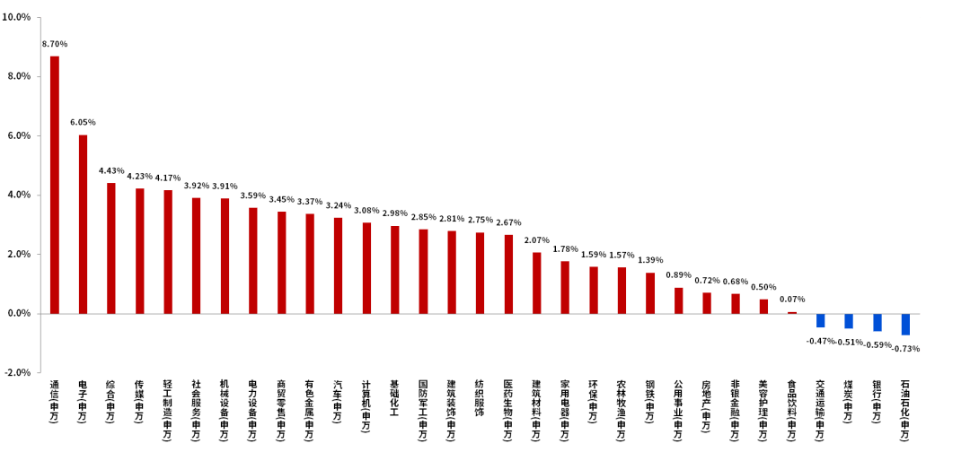海外方面,美联储降息预期再度回升。9月美国非农新增就业数据超预期,但失业率进一步上行至 4.4%。美联储理事米兰表示,美国经济需要大幅降息,货币政策阻碍了经济发展。此前,美联储官员 戴利也表示支持在12月美联储会议上降低利率。 目前美国就业市场仍处于温和放缓的"紧平衡",高利率压制利率敏感型行业就业,12月降息的概率或较 大。不过,经历近期市场震荡后,即使美联储在12月不降息对市场的影响可能也有限。 回顾11月,A股市场整体呈现震荡格局,上证指数月内小幅下跌1.67%,而创业板指、科创50指数则分 别下跌4.23%和6.24%。其中市场结构显著切换,资金寻求组合再平衡,月度看银行、石化、纺服、轻 工等行业涨幅居前,电子、计算机、汽车等行业回调明显。 宏观分析: 美联储降息概率提升 国内方面,10月规上工业企业利润转弱,利润修复仍需依托需求改善与政策发力形成合力。国家统计局 发布数据显示,1-10月规上工业企业利润累计同比增速为1.9%,较1-9月的2.4%回落0.6个百分点,其中 10月同比增速为-5.5%,较9月的21.6%由正转负。 分析来看,一方面,上年同期基数明显抬高,对同比增速有一定影响。另一方面, ...