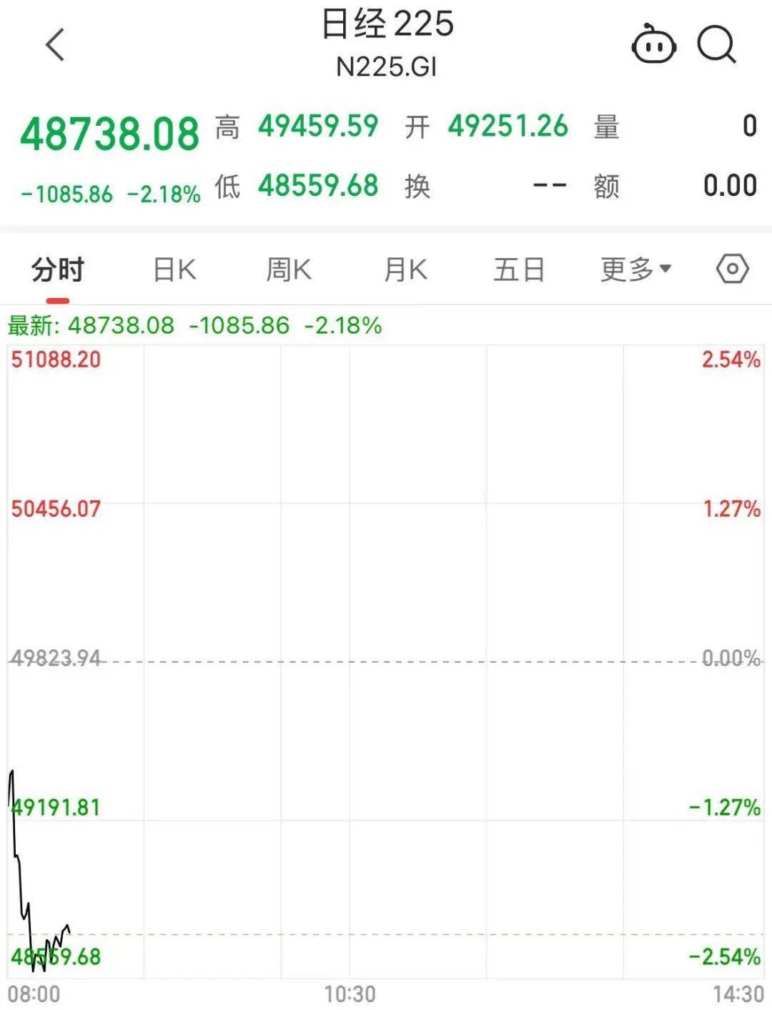 每经编辑|陈柯名 21日,日本股市低开低走,日经225指数迅速击穿49000点。截至发稿,日经225指数跌超2%报48738点,再度跌超千点。此前在本周二(18日),日经225指 数就出现了开盘跳水跌超千点的市况。 热门个股上,软银股价一度下跌11%,创11月5日以来最大跌幅。日本铠侠股价一度下跌16%。消息面上,日本11月份标普全球制造业PMI报48.8。 | < | 日轻 225 | | © Q | | --- | --- | --- | --- | | N225.GI | | | | | 0 48738.08 高 49459.59 开 49251.26 量 | | | | | i -1085.86 -2.18% 低 48559.68 换 -- 18 | | 额 | 0.00 | | 分时 | | | | | 最新: 48738.08 -1085.86 -2.18% | | | | | 51088.20 | | | 2.54% | | 50456.07 | | | 1.27% | | 49823.94 | | | - 0.00%- | | 49191.81 | | | -1.27% | | 485 69. ...