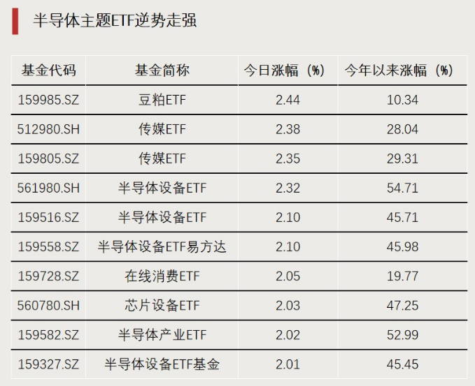 01 11月18日,全市场1300余只ETF中,200余只收涨,涨幅大于1%的有52只。 02 市场整体回调,半导体主题ETF逆势走强,多只产品涨超2%,跻身涨幅榜前十。豆粕期货、传媒股等 相关ETF表现相对亮眼。 03 资金流向方面,前一交易日(11月17日),ETF市场整体净流入超过170亿元。11月14日、11月17日两 个交易日,资金持续逆势加仓ETF,ETF市场每日净流入额均超百亿元。 半导体主题ETF上涨 11月18日,主投半导体(含芯片)相关指数的ETF中,除了中韩半导体ETF外,其余全部上涨,有6只 相关ETF跻身单日涨幅榜前十。 其中,半导体设备ETF(561980)以2.32%涨幅位居同类产品首位,该基金挂钩中证半导体产业指数, 前三大权重股分别为中微公司、北方华创(002371)、寒武纪,权重占比均超10%。 主投豆粕期货、传媒股等资产的ETF行情表现突出。豆粕ETF(159985)以2.44%涨幅居ETF市场首位, 全天成交7.89亿元,较前一交易日成交额增超3.7倍。2只传媒相关ETF涨幅紧随其后,均涨超2.3%。 | 基金代码 | 基金简称 | 今日涨幅(%) | 今年以来涨幅(% ...