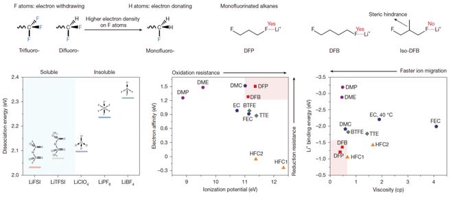 来源:科技日报 为此,南开大学团队设计合成了系列新型氟代烃溶剂分子,通过调控氟原子的电子密度和溶剂分子的空 间位阻,实现电解液中锂盐的有效溶解,成功取代了传统的锂—氧配位方式。 通过进一步优化分子结构,团队厘清了该类电解液的设计原则和锂金属相容性规律。相比于传统基于锂 —氧配位的电解液体系,由于氟代烃溶剂浸润性好,利用率高,可显著降低电解液用量;同时锂与氟配 位更弱,在低温下可摆脱束缚,仍具有快速的电荷转移动力学。从而助力实现室温700瓦时/公斤超高比 能锂金属电池,同时在-50℃环境中,电池仍展现出接近400瓦时/公斤的高能量密度。 赵庆介绍,通过氟配位实现锂盐溶解的关键是调控氟原子的电子密度和溶剂分子的空间位阻,新研发锂 电池具有高比能、耐低温等优势。 "基于该电解液的高比能电池在新能源汽车、具身智能机器人、低空经济以及极寒地区和航空航天等领 域具有广阔的应用潜力。"陈军说。 科技日报记者 陈曦 通讯员 李享 记者2月26日从南开大学获悉,该校化学学院研究员赵庆,中国科学院院士、南开大学常务副校长陈军 团队,联合上海空间电源研究所研究员李永在《自然》发表突破性成果。研究团队打破锂电池延续两百 年的"氧配位 ...