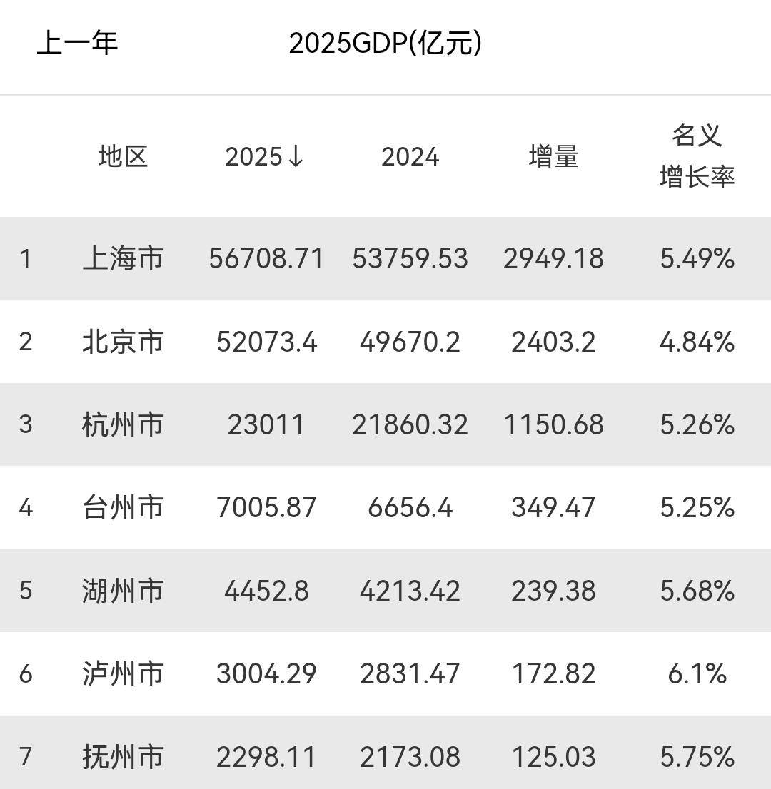 2025年的GDP数据新鲜出炉啦!七大城市的表现真是让人眼前一亮,尤其是杭州、台州和泸州这几个亮点,咱们一起来瞧瞧这些数字背后的故事吧。先说整 体,经济复苏的势头挺稳的,各城都在稳步爬坡,但增速有快有慢,这背后藏着不少有趣的细节呢。 | | 上一年 | 2025GDP(亿元) | | | | | --- | --- | --- | --- | --- | --- | | | 地区 | 2025 ↓ | 2024 | | 名义 增长率 | | 1 | 上海市 | 56708.71 53759.53 | | 2949.18 | 5.49% | | 2 | 北京市 | 52073.4 | 49670.2 | 2403.2 | 4.84% | | 3 | 杭州市 | 23011 | | 21860.32 1150.68 | 5.26% | | 4 | 台州市 | 7005.87 | 6656.4 | 349.47 | 5.25% | | 5 | 湖州市 | 4452.8 | 4213.42 | 239.38 | 5.68% | | 6 | 泸州市 | 3004.29 | 2831.47 | 172.82 | 6.1% ...