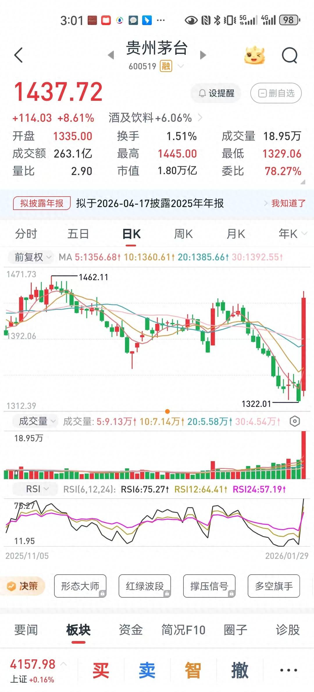 A股板块轮番涨,突然一夜之间到了白酒类股票,谁能想象到贵州茅台开始领涨,在9连跌之后低位盘整,创下了3年来的最低价1437元之后发力,1月29日 大涨近9%,一天就补了之前的巨大下跌缺口。在这背后,到底是有着段永平所谓的"茅台信仰",还是游资的炒作结果呢? 贵州茅台的29日走势,让股民觉得猝不及防。股价开盘之后一路向上,最高涨到了1445元,最终收盘涨了8.61%,市值增加了近1800亿元。最关键的是,一 天的涨幅覆盖了前期十多个交易日的跌幅,同时白酒类股票纷纷涨停,高科技类股票纷纷下跌,股民慨叹,股市热点变化快,到底谁在后面兴风作浪? 如果追踪一切的源头,可能还是要从一周前段永平的某球平台发言谈起,他自述拥有贵州茅台A股4万股,还准备增持2万股,而且已经开始在贵州茅台每股 1365元左右,动手买入2万股茅台。因为属于公众人物,某球不让晒交割单。之后段永平开始讲述现在茅台的直销模式,打开了普通人买到真茅台的口子, 所以"10年后来看,今天的茅台是真的不贵。" 好似配合他的言语,在最近的酒业数据平台"今日酒价"上也开始显示,53度飞天茅台价格稳步上升,不但稳住了市场终断指导价1499元,而是还在不断向上 突破。 ...