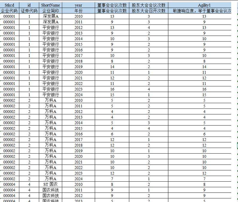 数据简介 企业敏捷响应度是企业适应外部环境变化、迅速调整策略以抓住市场机遇和应对挑战的能力。这种能力在当今快 速变化的市场环境中尤为重要,因为它直接关系到企业的竞争力和可持续发展。 本数据参考C刊《经济管理》范合君(2024)老师的做法,现代企业特别是上市公司重大决策是由董事会讨论做 出的鉴于此,本文采用当期董事会会议次数测度企业敏捷响应度(测算结果为agility_1),次数越多,表明企业 对外界变化的响应速度越快。此外,本文还采用企业当期召开的股东大会会议次数作为敏捷响应度的替代变量进 行稳健性检验。(测算结果为agility_2) | Stkcd | id | ShortName | year | 董事会会议次数 | 股东大会会议次数 | Agility1 | | --- | --- | --- | --- | --- | --- | --- | | 企业代码 | 证券代码 | 企业简称 | 年份 | 董事会会议次数 | 股东大会召开次数 | 敏捷响应度, 等于董事会会议/ | | 000001 | 1 | 深发展A | 2010 | 13 | 3 | 13 | | 000001 | 1 | 深发展A ...
