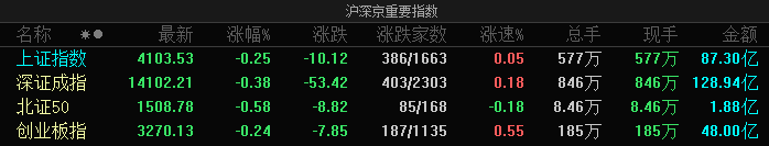 凤凰网财经讯 1月21日,三大指数集体低开,沪指低开0.25%,深成指低开0.38%,创业板指低开 0.24%,商业航天、电网、AI应用等板块指数跌幅居前。 | | | | | 沪深京重要指数 | | | | | --- | --- | --- | --- | --- | --- | --- | --- | | 名称 *● | 最新 | 涨幅% | | 张跌 | 张速% | 息手 | 现手 金额 | | 上证指数 | 4103.53 | -0.25 | -10.12 | 386/1663 | 0.05 | 577万 | 577万 87.30亿 | | 深证成指 | 14102.21 | -0.38 | -53.42 | 403/2303 | 0.18 | 8467 | 846万 128.94亿 | | 北证50 | 1508.78 | -0.58 | -8.82 | 85/168 | -0.18 | 8.46 7 | 1.88 7. 8.46万 | | 创业板指 | 3270.13 | -0.24 | -7.85 | 187/1135 | 0.55 | 185万 | 185万 48.00亿 | 外盘市场: 由 ...