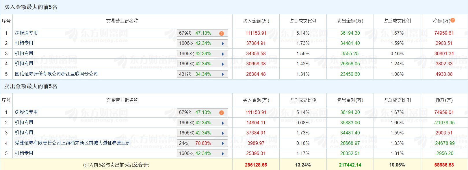 | 买入金额最大的前5名 | | | | | | | | --- | --- | --- | --- | --- | --- | --- | | 序号 | | 交易营业部名称 | | | 买入金额(万) | 占总成交比例 | | 1 | 深股通专用 | | 687次 47.16% | 2 | 44914.45 | 4.36% | | 2 | 机构专用 | | 1594次 42.35% | ▶ | 24556.49 | 2.38% | | 3 | 东吴证券股份有限公司上海西藏南路证券营业部 | | 10次 30.00% | | 13703.16 | 1.33% | | 4 | 国信证券股份有限公司浙江互联网分公司 | | 428次 34.81% | ▶ | 11435.46 | 1.11% | | 5 | 机构专用 | | 1594次 42.35% | A | 9916.21 | 0.96% | | 卖出金额最大的前5名 | | | | | | | | 序号 | | 交易营业部名称 | | | 买入全额(万) | 占总成交比例 | | 序号 | 交易营业部名称 | | 买入金额(万) | 占总成交比例 | | ...