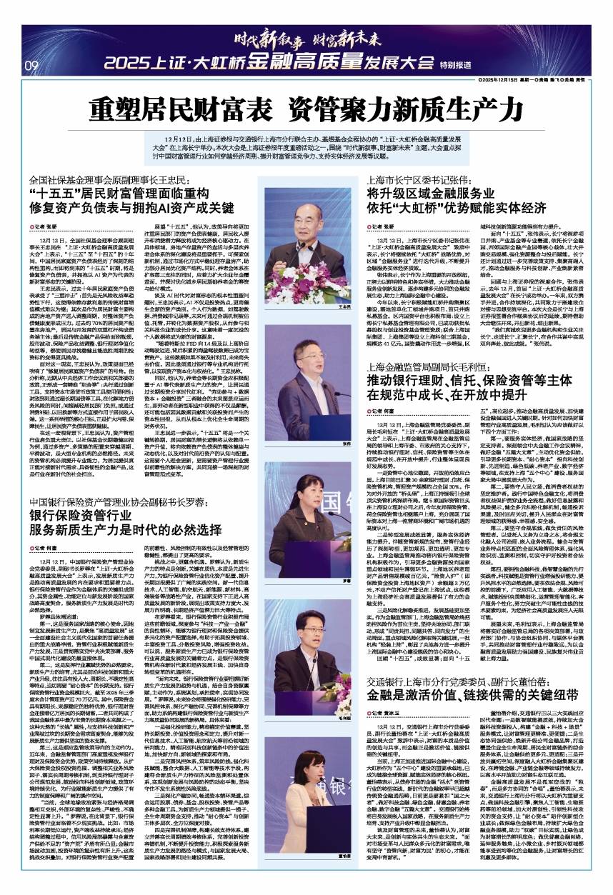 12月12日,全国社保基金理事会原副理事长王忠民在"上证·大虹桥金融高质量发展大会"上表示,"十三五"至"十四五"的十 年间,中国居民家庭资产负债表经历了深刻的结构性重构,而即将到来的"十五五"时期,将是修复资产负债表,并拥抱以 AI资产为代表的新财富形态的关键阶段。 2025上证·大红桥立 重塑居民财富表 资管聚力新质生产力 12月12日,由上海证券报与交通银行上海市分有联合主办,基恩基金会程协内的"上证·大虹桥企融高质量发展 大会"在上海长宁举办。本次大会是上海证券报年度重磅活动之一,图绕"时代新叙事,财富新未来"主题,大会量点探 讨中国财富管理行业如何穿越经济周期、提升财富管理竞争力、支持实体经济发展等议题。 全国社保基金理事会原副理事长王忠民: "十五五"居民财富管理面临重构 修复资产负债表与拥抱AI资产成关键 O 切者 张颐 12月 12 日,全国社保基会规率会展副团 关于忠国在 "上证·大虹桥会融高质量发展 曝长平集团在 大会"上表示,"十三五" 在"十四五" 的十年 同,中国民家重费产负债表经历了资商领域。 两性宣传,.而即将到求的"十五" 时期,将是 新时冒形态的关键阶段。 王虎民表示,过去十 ...