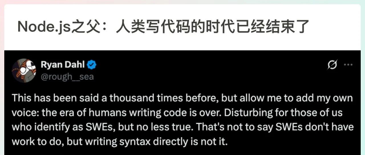 Node.js 之父在他的社交媒体上说的很直接: 人类编写代码的时代已经结束了。 然后补充说明并不是不需要工程师,而是工作方式转变了: Ryan Dahl 本人就提到,他现在主要用 Claude Code 写代码,自己更多是审查、迭代和做高层决策。谷歌、微软、亚马逊等大厂内 部已有大量代码由 AI 生成。生产力数据也支持:使用 AI 辅助的开发者平均效率提升 30-55%,初学者门槛大幅降低。 这几年 AI 技术突飞猛进,尤其是 AI 编程工具(Cursor、Claude Code、Qoder、Trae 等)越来越厉害,确实把软件开发的路子给 改了。许多开发者日常工作中 70-90% 的增删改查操作都交给 AI 完成。 虽说 AI 编程还没完全取代咱们开发者,但效率提得可不是一点半点 —— 把大家从烦人的底层语法细节里解放出来,不 用再死抠那 些细枝末节,反而能专心搞更重要的系统设计、需求分析和代码审查。 像这个用户说的: 真正的转变或许是从"编写代码"到"审查代码"——仍然需要有人深刻理解优秀代码的标准,才能发现人工智能自信地生成优雅却无意 义的代码。 这对我们这些自认为是软件工程师的人来说或许令人不安,但 ...