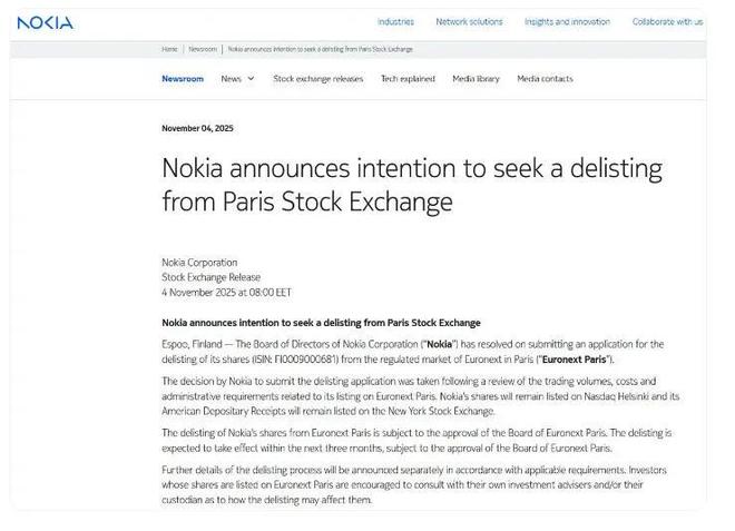 诺基亚官网宣布,公司股票从巴黎泛欧交易所退市