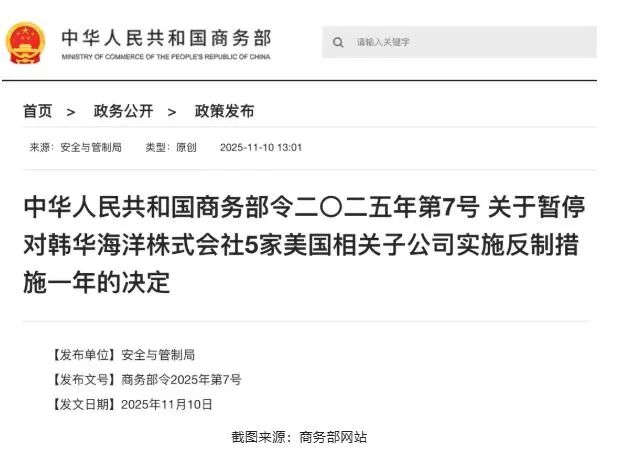 来源:商务部网站 中华人民共和国商务部令二〇二五年第7号 关于暂停对韩华海洋株式会社5家美国相关 子公司实施反制措施一年的决定 中华人民共和国商务部令 二〇二五年 第7号 鉴于美国自2025年11月10日起暂停实施其对中国海事、物流和造船业301调查措施一 年,现公布《关于暂停对韩华海洋株式会社5家美国相关子公司实施反制措施一年的决 定》,自2025年11月10日起施行。 部长 王文涛 2025年11月10日 关于暂停对韩华海洋株式会社5家美国相关 子公司实施反制措施一年的决定 美东时间2025年11月9日,美国宣布自11月10日起暂停实施其对中国海事、物流和造 船业301调查措施一年。鉴此,根据《中华人民共和国反外国制裁法》《实施〈中华 人民共和国反外国制裁法〉的规定》等法律法规,中方决定自北京时间2025年11月 10日起,暂停商务部令二〇二五年第6号(《关于对韩华海洋株式会社5家美国相关子 公司采取反制措施的决定》)相关措施一年。 ...