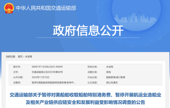 11月10日,交通运输部发布《关于暂停对美船舶收取船舶特别港务费、暂停开展航运业造船 业及相关产业链供应链安全和发展利益受影响情况调查的公告》。 以下为原文 | 中华人民共和国交通运输部 | | | Can Public | | --- | --- | --- | --- | | 政府信息公开 | | | | | 当前位置:首页 >水运局 | | | | | 索引号: | 000019713008/2025-00049 | 机构分类: | 水运局 | | 文号: 交通运输部公告2025年第60号 | | 主题分类: | 其他 | | 主题词: 暂停对美船舶收取船舶特别港务费:暂停开 ... | | 公文类型: | 部公告通告 | | 公开日期: 2025年11月10日 | | 行业分类: | 船舶建建:滇口管理 | | 交通运输部关于暂停对美船舶收取船舶特别港务费、暂停开展航运业造船业 | | | | 交通运输部 2025年11月10日 【责任编辑:刘澄谚 】 及相关产业链供应链安全和发展利益受影响情况调查的公告 为落实2025年中美吉隆坡经贸磋商达成共识,经国务院批准,自2025年11月10日13时01分起 ...