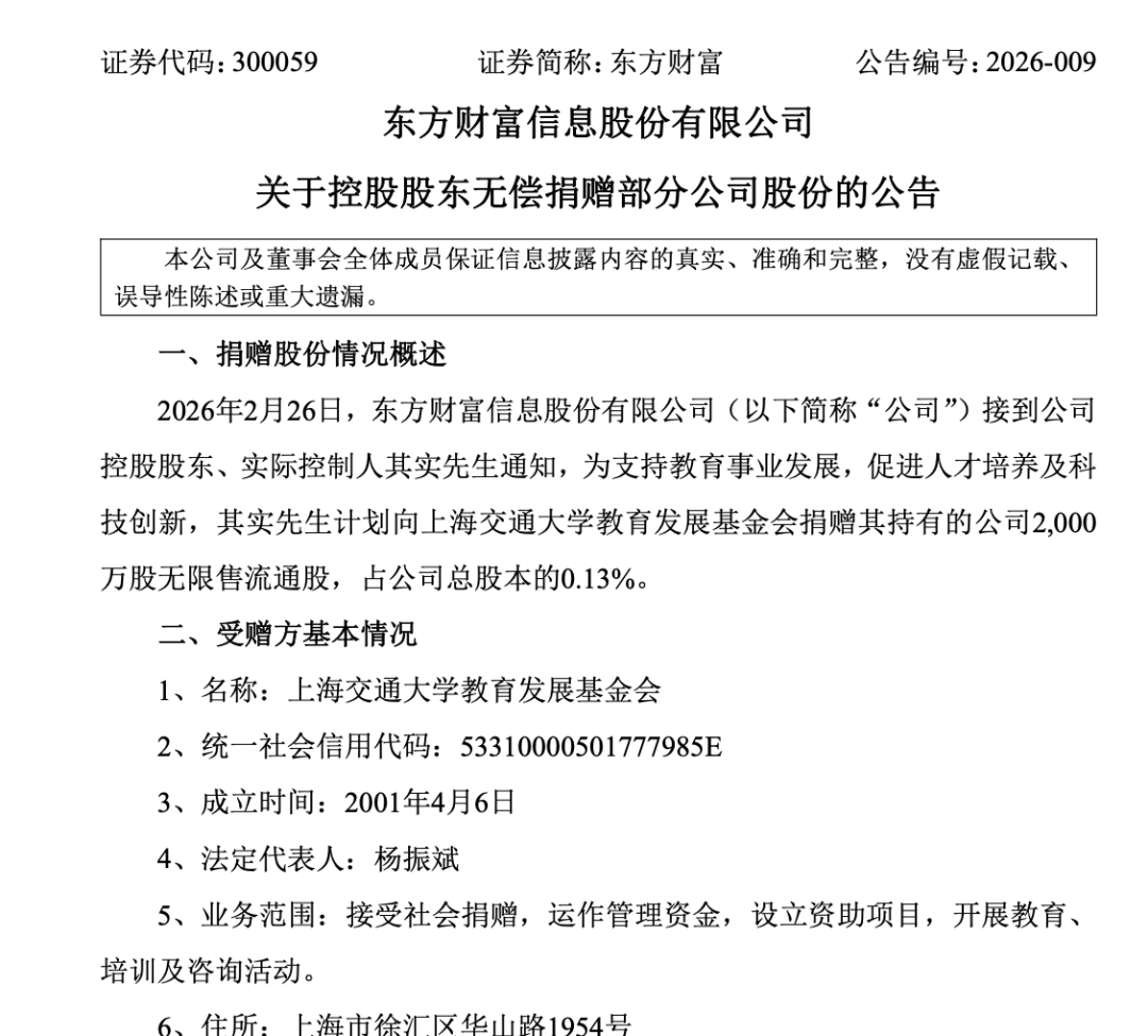 每经编辑|程鹏 上海交通大学接连获校友大额捐赠。 东方财富今日(2月26日)公告称,接到公司控股股东、实际控制人其实通知,为支持教育事业发展,促进人才培养及科技创新,其实计划向上海交通大 学教育发展基金会捐赠其持有的公司2000万股无限售流通股,占公司总股本的0.13%。截至今日收盘,东方财富报22.50元/股,据此粗略估算,所捐赠的 2000万股约合4.5亿元。数据显示,截至2025年3季度末,其实位列东方财富第一大股东,持有30.62亿股,持股比例19.38%。 "上海交通大学" 图 著名企业家、华住集团创始人,上海交大工程力学系1989届本科校友、机械工程系1992届硕士校友季琦,向母校捐资1亿元人民币,支持学校各项事业发 展。 上海交大党委书记杨振斌,上海交大校长、中国科学院院士丁奎岭共同为季琦颁发校董聘书。 "上海交通大学" 图 杨振斌感谢季琦的慷慨捐赠。他表示,季琦"将自己独有的人生感悟、创业智慧与人文情怀,深深融入母校高质量发展的每一步,彰显了交大人以实际行 动践行'饮水思源,爱国荣校'校训的责任与担当"。此次设立"全季人文发展基金",将助力百年校园焕发人文新彩,丰富校园文化生活,厚植人文底蕴, ...