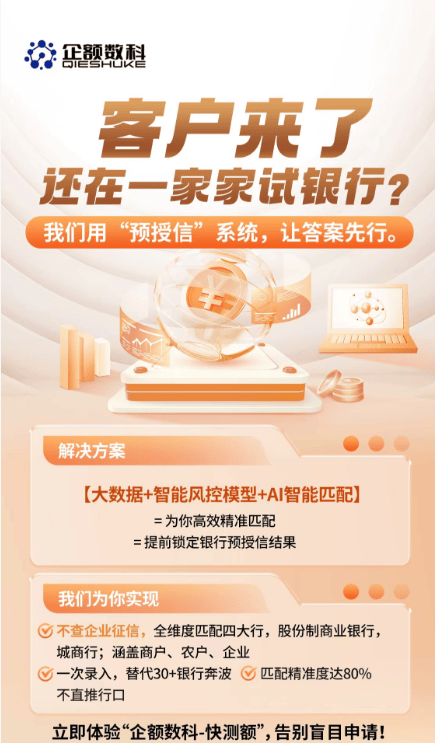 企额数科快测额系统的运作逻辑,聚焦于企业经营数据与系统内银行产品库的高效匹配。该系统仅在经营层面进行数据分析与模型比对,并不涉及向银行端 的正式信息推送。这意味着,企业在系统内完成产品匹配的过程后看额度,实质上是一次非正式、零风险的预评估体验。 用户在系统内进行模拟匹配时,完全无需担心对后续正式申请造成影响。实际上,在正式向银行提交申请之前,通过系统提前进行额度预评估,不仅不会产 生任何负面记录,反而能为企业提供重要的决策参考。企业可以借此清晰、直观地"看额度",了解自身在当前模型下的融资潜力范围。 更重要的是,这一预评估机制能够帮助企业提前洞察潜在的审批障碍。系统可模拟银行审核逻辑,提示可能的否决理由或材料缺陷,使企业有机会提前优化 资质或调整申请策略。这样一来,企业能够有效避免因盲目申请而导致的征信查询次数增加,保护自身信用记录不受无损损耗。 因此,我们鼓励企业在规划融资时,先将企额数科快测额系统作为"预审通道"使用。通过先行"看额度"、了解匹配结果与风险提示,企业能够以更理性、更 高效的方式推进后续正式融资流程,真正实现智慧融资、信用无忧。 看额度 看额度 ...
