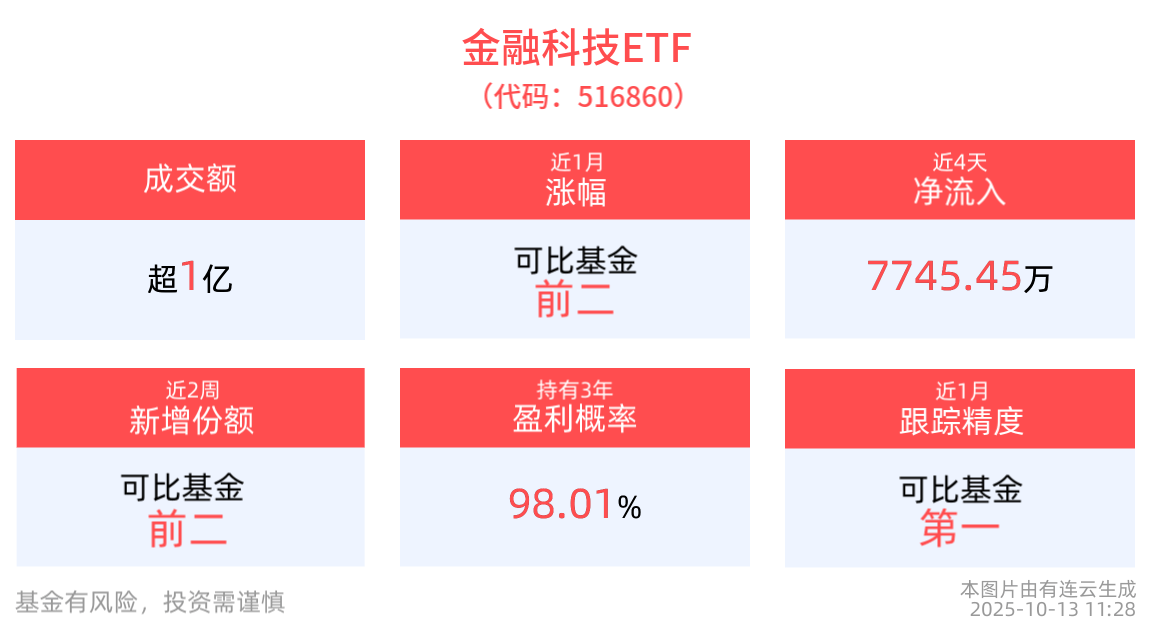 截至2025年10月13日 11:28,中证金融科技主题指数下跌1.95%。成分股方面涨跌互现,润和软件领涨2.94%,普元信息上涨2.85%,信安世纪上涨1.75%;指 南针领跌4.96%,财富趋势下跌4.17%,银之杰下跌4.08%。金融科技ETF(516860)下跌1.88%,最新报价1.51元。拉长时间看,截至2025年10月10日,金融科 技ETF近3月累计上涨3.92%,涨幅排名可比基金2/6。 流动性方面,金融科技ETF盘中换手4.28%,成交1.07亿元。拉长时间看,截至10月10日,金融科技ETF近1月日均成交2.86亿元,居可比基金前2。 政策方面,金融政策发力支持,支持宏观经济运行。国家发改委会同有关方面正积极推进新型政策性金融工具有关工作,新型政策性金融工具规模共5000亿 元,全部用于补充项目资本金。金融政策持续发力,资本市场有望迎来基本面与流动性改善的共振,直接利好政策敏感度较高的金融科技板块。 据报道,上海成立数币运营中心,金融创新再迎新举措。9月24日,数字人民币国际运营中心在上海正式运营。数字人民币国际运营中心由中国人民银行数 字货币研究所筹建和管理,负责建设运营数字人民币跨 ...