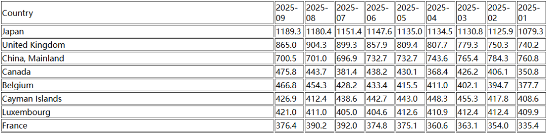 【导读】海外投资者持有美国国债总额为9.249万亿美元,低于8月的9.2662万亿美元 美国财政部公布了8月和9月美债持仓情况。数据显示,9月,外国投资者持有美国国债规模有所下降,其中,日本的美债持仓量在8月和9月大幅增加,中 国和英国在9月减持美债。 日本增持 英国和中国减持 因美国政府停摆,美国财政部于美东时间周二才发布8月和9月的国际资本流动报告(TIC)。 数据显示,9月,海外投资者持有的美国国债总额为9.249万亿美元,低于8月的9.2662万亿美元。 由于债券持仓量受净买卖以及价格变动影响,结合8月、9月彭博美国国债指数上涨态势,反映外国投资者在9月净卖出了美国国债。 有券商分析师向中国基金报记者表示,央行对美债操作的不同方向,反映出不同的外部资产配置方向,短期来看,对全球资本流动影响不大。对中国央行 而言,未来或仍会适度减持美债。 美国财政部还调整了部分此前数据。更正后的数据显示,2025年1月,中国增持18亿美元美国国债,2月增持235亿美元,3月减持189亿美元,4月减持218 亿美元,5月减持109亿美元,6月持有量保持不变,7月减持358亿美元,8月增持41亿美元。 | Country ...