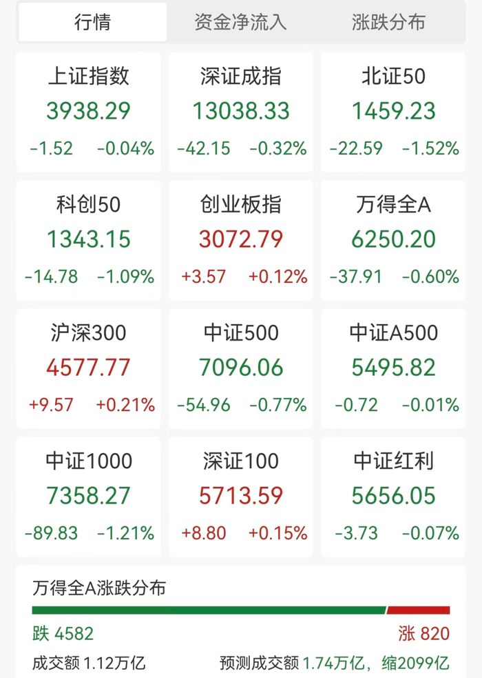 11月19日,A股三大指数涨跌不一,截至中午收盘,沪指冲高回落跌0.04%,创业板指一度涨超1%。中 小盘股普跌,微盘股指数跌超2%。沪深两市半日成交额1.12万亿,较上个交易日缩量2099亿。市场共 4582股下跌,820股上涨。 | 行情 | 资金净流入 | 涨跌分布 | | --- | --- | --- | | 上证指数 | 深证成指 | 北证50 | | 3938.29 | 13038.33 | 1459.23 | | -1.52 -0.04% -42.15 -0.32% -22.59 -1.52% | | | | 科创50 | 创业板指 | 万得全A | | 1343.15 | 3072.79 | 6250.20 | | -14.78 -1.09% +3.57 +0.12% -37.91 -0.60% | | | | 沪深300 | 中证500 | 中证A500 | | 4577.77 | 7096.06 | 5495.82 | | +9.57 +0.21% -54.96 -0.77% -0.72 -0.01% | | | | 中证1000 | 深证100 | 中证红利 | | 7358.27 | ...