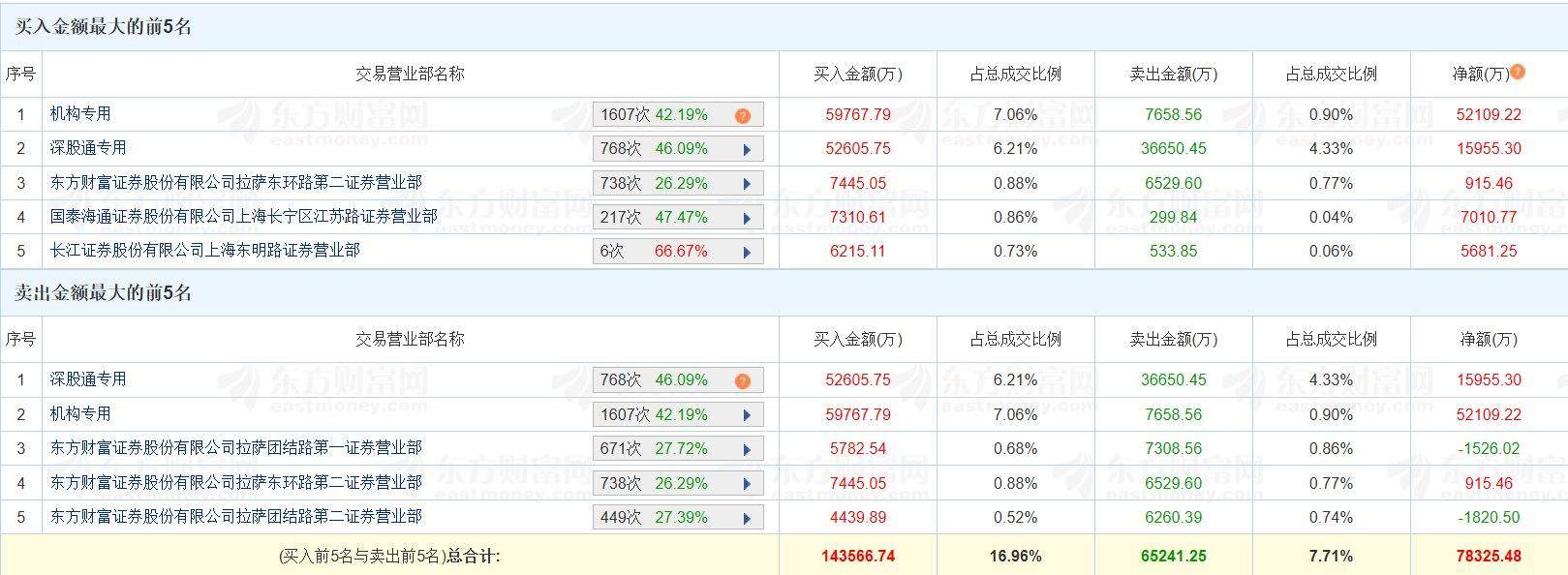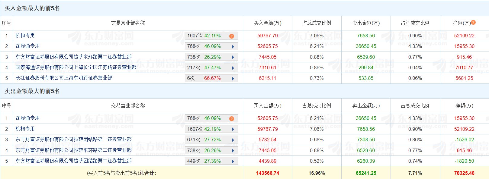 | 买入金额最大的前5名 | | | | | | | --- | --- | --- | --- | --- | --- | | 序号 | 交易营业部名称 | | | 买入金额(万) | 占总成交比例 | | 1 | 机构专用 | 1607次 42.19% | 2 | 59767.79 | 7.06% | | 2 | east money.com 深般通专用 | 768次 46.09% | ▶ | 52605.75 | 6.21% | | 3 | 东方财富证券股份有限公司拉萨东环路第二证券营业部 | 738次 26.29% | | 7445.05 | 0.88% | | 4 | 国泰海通证券股份有限公司上海长宁区江苏路证券营业部 | 217次 47.47% | | 7310.61 | 0.86% | | 5 | 长江证券股份有限公司上海东明路证券营业部 | 6次 66.67% | ▲ | 6215.11 | 0.73% | | | 卖出金额最大的前5名 | | | | | | 序号 | 交易营业部名称 | | 买入金额(万) | 占总成交比例 | | --- | --- | --- | --- | --- | ...