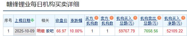 龙虎榜 | 赣锋锂业涨停,一机构净买入5.21亿元