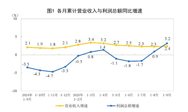 1—9月份规模以上工业企业利润加快恢复 ——国家统计局工业司首席统计师于卫宁解读2025年1—9月份工业企业利润数据 1—9月份,各地区各部门认真落实更加积极有为宏观政策,培育壮大新经济增长点,高技术制造业、装 备制造业等新质生产力较快增长,叠加低基数效应影响,规模以上工业企业利润增速继续回升。 工业企业利润加快恢复。1—9月份,规模以上工业企业利润同比增长3.2%,为去年8月份以来各月累计 最高增速;较1—8月份加快2.3个百分点,呈现加快恢复态势。从三大门类看,1—9月份,制造业增长 9.9%,较1—8月份加快2.5个百分点;电力、热力、燃气及水生产和供应业增长10.3%,加快0.9个百分 点;采矿业下降29.3%,降幅收窄1.3个百分点。9月份,规模以上工业企业利润同比增长21.6%,较8月 份加快1.2个百分点。 工业企业营收增长加快。1—9月份,规模以上工业企业营业收入同比增长2.4%,较1—8月份加快0.1个 百分点。其中,9月份营业收入增长2.7%,较8月份加快0.8个百分点,营业收入当月增速连续两个月加 快,为企业盈利持续恢复创造有利条件。 高技术制造业带动作用明显。1—9月份,规模以上高技术 ...