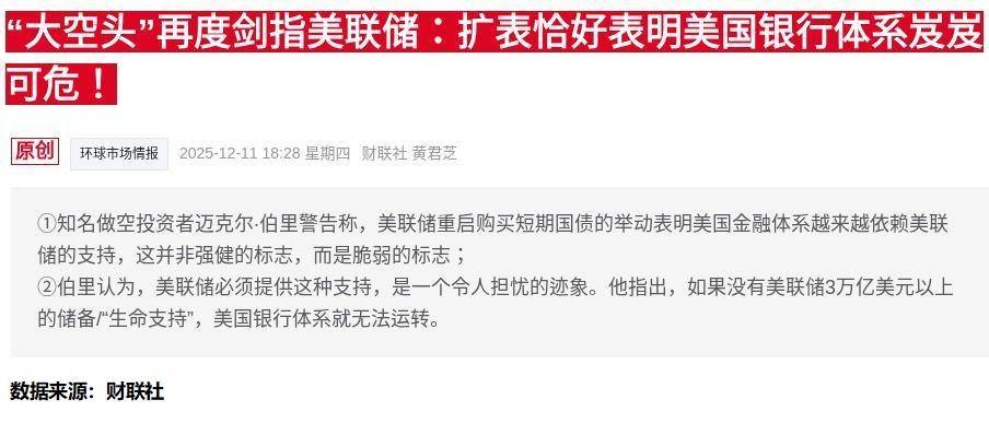 引子 华尔街又炸锅了。那个在2008年金融危机前就精准做空抵押贷款支持证券的"大空头"迈克尔·伯里,最近又放了个重磅炸弹。他说美联储重启短期国债购买 计划,暴露了美国金融体系的严重问题。这话一出,市场立刻骚动起来。 伯里的观点很尖锐:"如果没有美联储3万亿美元以上的储备金支撑,美国银行体系就无法运转。"他认为这不是强健的标志,而是脆弱的标志。这话让我想 起股市里一个永恒的话题:预期与现实之间的鸿沟。 一、预期差才是市场的本质 股市炒得从来不是现实差,而是预期差。现实再烂,只要预期反转,市场就会给予正反馈。这就是著名的"困境反转"现象。所谓预期差就是:我知道你不知 道,我会你不会,我敢你不敢。 本质上,这就是信息不对称导致的游戏。而解决信息不对称的核心在于透过现象看到交易的真相。显然,只有数据可以还原这个真相。 诡异的是2025年情况大变。同样是金价上涨,同样是菜百股份,这次表现却是一路上涨。主营没变、题材没变,唯一的变化就是橙色"机构库存"数据在不断 活跃。 这个案例生动地说明了一个道理:同样的基本面条件下,机构资金的态度决定了股价走向。没有机构参与的利好不是真利好。 伯里的警告之所以重要,不是因为他预测了什 ...