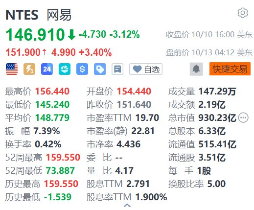 | NTES 网易 | | 03 | | --- | --- | --- | | 146.910 ↓ -4.730 -3.12% | | 收盘价 10/10 16:00 美东 | | 151.900 + 4.990 +3.40% | | 盘前价 10/13 04:12 美东 | | 二 24 24 2 8 8 0 目 ♥ 自选 | | 4 快捷交易 | | 最高价 156.440 | 开盘价 154.440 | 成交量 147.29万 | | 最低价 145.240 | 昨收价 151.640 | 成交额 2.19亿 | | 平均价 148.779 | 市空室 19.70 | 总市值 930.23亿 … | | 振 幅 7.39% 市盈率(静) 22.81 | | 总股本 6.33亿 | | 市净率 4.436 换手率 0.42% | | 流通值 515.41亿 | | 52周最高 159.550 委 比 -- | | 流通股 3.51亿 | | 52周最低 73.887 量 比 4.17 | | 色 主 1股 | | 历史最高 159.550 股息TTM 2.791 换股比率 5.00 | | | | 历史 ...