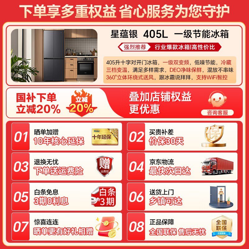 下单享多重权益 省心服务为您守护 星蕴银 405L 一级节能冰箱 强烈推荐 > 行业爆款冰箱l高性价比 405升十字对开门冰箱、一级双变频,低噪节能,冷藏 三档变温,满足多样需求,DEO净味保鲜,混放不串味 360°立体环绕式送风,跟冰霜说拜拜,支持WiFi智控 叠加店铺权益 国补下单 42096 更优惠 立减20% 晉闻客服 买贵补差 你假30娱 晒单加赠 02 01 10年 2000年保 退换无忧 京东物流 03 04 TSEFF 3 SEE N 量缺次冒涨 送货上门 白条免息 06 05 经镇回放 3期0利息 正品保障 惊喜连连 08 联保 l [ 单 更 ] 好 ] 相 赠 全国联席 售后无忧 V > 新浪财经APP 24 小时三球 基资讯 下载APP > 下单享多重权益 省心服务为您守护 星蕴银 405L 一级节能冰箱 强烈推荐 > 行业爆款冰箱|高性价比 405升十字对开门冰箱,一级双变频,低噪节能,冷藏 三档变温,满足多样需求,DEO净味保鲜,混放不串味 360°立体环绕式送风,跟冰霜说拜拜,支持WiFi智控 叠加店铺权益 国补下单 更优惠 立電20% 晒单加赠 买贵补差 01 02 优保305 ...