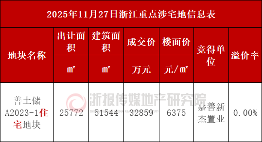 潮新闻客户端 记者 马梦婷 作为2025年嘉善出让的第一宗宅地,地块区位配套较佳,除万象汇外,北侧为中央公园,附近有亭桥小学、浙 师大附属嘉善实验学校初中部等教育配套。 地块最终一轮底价成交,由嘉善新杰置业以32859.3万元总价竞得,楼面价6375元/㎡。 项目区位图(来源:"决策通") 今日,嘉兴嘉善一宗宅地出让成交,是2025年嘉善出让的第一宗涉宅地。地块最终一轮底价成交,由嘉善新杰 置业以32859.3万元总价竞得,地价12750元/㎡,折合楼面价6375元/㎡。 | 2025年11月27日浙江重点涉宅地信息表 | | | | | | --- | --- | --- | --- | --- | | 出让面。 建筑面 积 积 地块名称 | 成交价 楼面价 | | 竞得单 位 | 溢价率 | | 11 16 2 2 2 1 1 2 善土储 A2023-1住 25772 51544 32859 宅地块 | | ZHILZA 6375 | 嘉善新 杰置业 | 0. 00% | | m² m² 万元 | | 元/m² | | | 嘉兴嘉善宅地低价成交 嘉善宅地位于罗星街道嘉善大道西侧、慈山路北侧,南侧即为嘉善万 ...