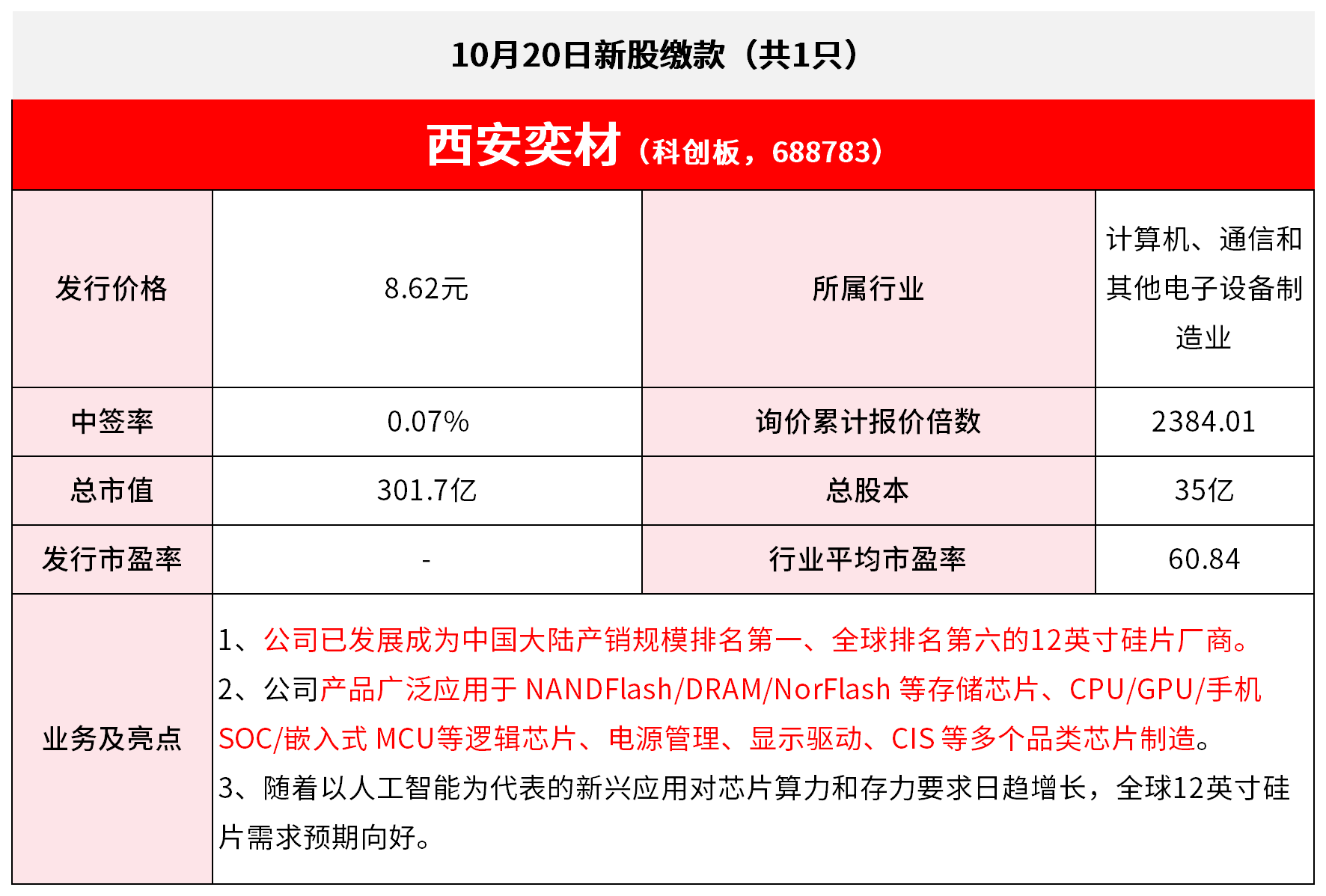 Group 1 - The core viewpoint of the article highlights that Xi'an Yicai has become the largest producer and seller in mainland China for its products, which are widely used in NAND Flash, DRAM, Nor, SOC, embedded MCU logic chips, power management, and display drivers [2] - The company has an issuance price of 8.62 yuan and a total market value of 30.17 billion yuan [2] - There is an optimistic outlook for chip demand driven by emerging applications represented by artificial intelligence, indicating a positive trend in market expectations for chip computing power [2]