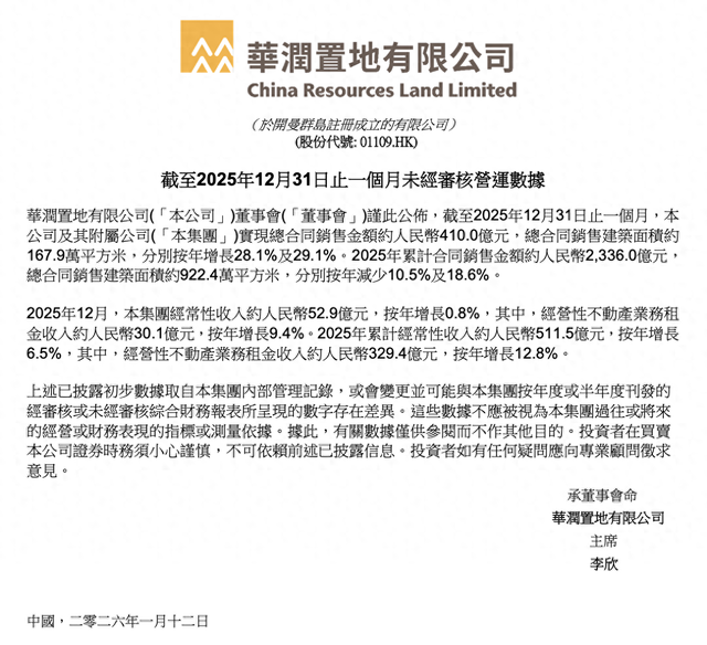 来源:环球网 【环球网综合报道】1月12日,华润置地公布截至2025年12月31日止一个月未经审核营运数据。 2025年12月,华润置地实现总合同销售金额410亿元,总合同销售建筑面积为167.9万平方米,分别按年 增长28.1%及29.1%。 2025年全年累计合同销售金额为2336亿元,累计合同销售建筑面积为922.4万平方米,分别按年减少 10.5%及18.6%。 经常性收入方面,华润置地2025年12月实现经常性收入为52.9亿元,按年增长0.8%。其中经营性不动产 业务租金收入为30.1亿元,按年增长9.4%。 2025年全年累计经常性收入为511.5亿元,按年增长6.5%,经营性不动产业务租金收入累计达到329.4亿 元,按年增长12.8%。 图源:华 润置地 ...