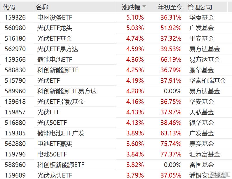 新能源午后拉升,电网设备ETF、光伏ETF龙头涨超5%,储能电池ETF、科创新能源ETF涨超4%
