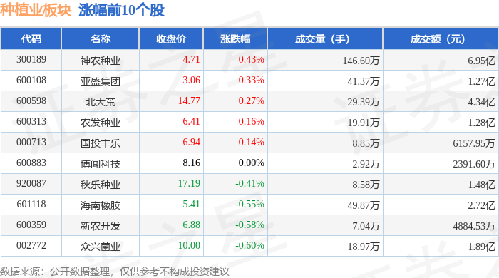 Core Insights - The planting industry sector experienced a decline of 0.8% on October 17, with notable losses from Nopson, which fell by 4.77% [1][2] - The Shanghai Composite Index closed at 3839.76, down 1.95%, while the Shenzhen Component Index closed at 12688.94, down 3.04% [1] Market Performance - The following companies in the planting industry showed varying performance: - Shennong Seed Industry: Closed at 4.71, up 0.43% with a trading volume of 1.466 million shares and a turnover of 695 million yuan - Yasheng Group: Closed at 3.06, up 0.33% with a trading volume of 413,700 shares and a turnover of 127 million yuan - Beidahuang: Closed at 14.77, up 0.27% with a trading volume of 293,900 shares and a turnover of 434 million yuan - Nopson: Closed at 10.99, down 4.77% with a trading volume of 326,100 shares and a turnover of 366 million yuan [1][2] Capital Flow - The planting industry sector saw a net outflow of 182 million yuan from main funds, while retail investors contributed a net inflow of 162 million yuan [2] - The following companies had significant capital flow: - Beidahuang: Main funds net inflow of 47.9853 million yuan, retail net outflow of 24.6923 million yuan - Nopson: Main funds net outflow of 15.5 million yuan, retail net inflow of 3.66 million yuan [3]
