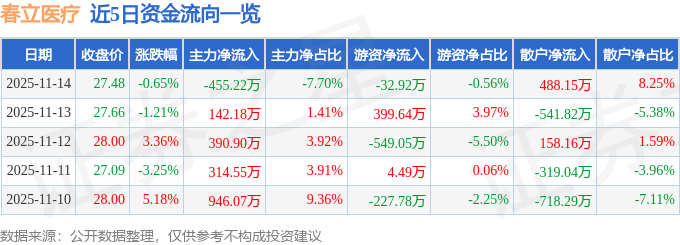 股票行情快报:春立医疗(688236)11月14日主力资金净卖出455.22万元
