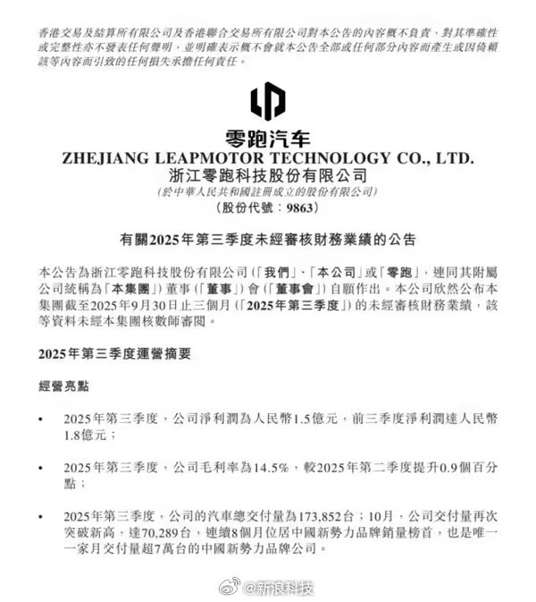 Core Insights - Leapmotor delivered 173,852 vehicles in Q3 2025, leading the sales among new energy vehicle brands in China, representing a 101.8% increase compared to the same period in 2024 [1] - The company has maintained its position as the monthly sales champion among new energy brands in China for eight consecutive months, with October's deliveries surpassing 70,289 units [1][7] Financial Performance - The net profit for Q3 2025 was RMB 150 million, with a total net profit of RMB 180 million for the first three quarters of 2025 [7] - The gross profit margin for Q3 2025 was 14.5%, an increase of 0.9 percentage points from Q2 2025 [7]