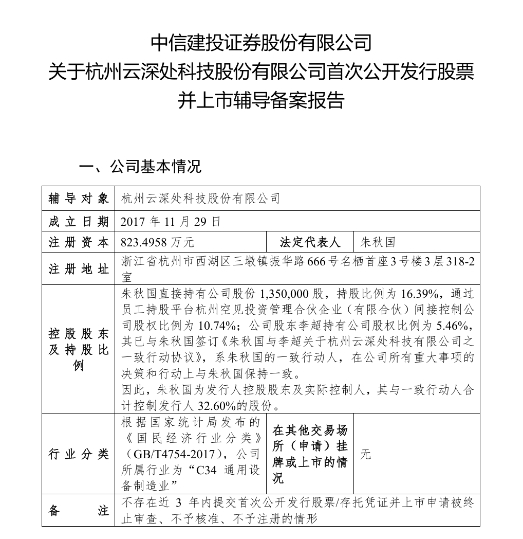 每经AI快讯,据证监会官网,杭州云深处科技股份有限公司于2025年12月23日正式启动上市辅导,中信建投证券担任辅导机构。 | 辅导 对 象 | 杭州云深处科技股份有限公司 | | --- | --- | | 成立日期 | 2017年11月29日 | | 注册资本 | 823.4958 万元 法定代表人 朱秋国 | | 注册地址 | 浙江省杭州市西湖区三墩镇振华路 666号名栖首座3号楼3层 318-2 | | | 家 | | 控 股 股 东 | | | | 朱秋国直接持有公司股份 1,350,000股,持股比例为 16.39%,通过 员工持股平台杭州空见投资管理合伙企业(有限合伙)间接控制公 | | | 司股权比例为 10.74%;公司股东李超持有公司股权比例为 5.46%, | | | 其已与朱秋国签订《朱秋国与李超关于杭州云深处科技有限公司之 | | 及持股比 | 一致行动协议》,系朱秋国的一致行动人,在公司所有重大事项的 | | 例 | 决策和行动上与朱秋国保持一致。 | | | 因此,朱秋国为发行人控股股东及实际控制人,其与一致行动人合 | | | 计控制发行人 32.60%的股份。 | | 行业分 ...