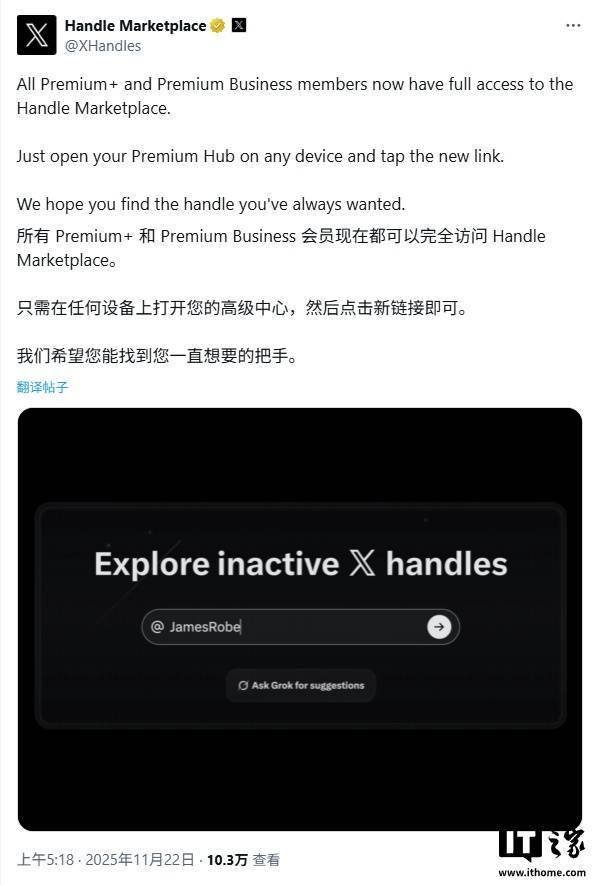 IT之家 11 月 24 日消息,科技媒体 TechSpot 昨日(11 月 23 日)发布博文,报道称埃隆・马斯克(Elon Musk)旗下的 X 平台正式上线会员"靓号"服务,推出用户名交易市场(Handle Marketplace),允许用 户购买并申领此前无法获取的休眠账号。 进入该市场需要满足前置条件,用户必须订阅每月 40 美元(IT之家注:现汇率约合 284.5 元人民币) 的 Premium+ 套餐或每月 200 美元(现汇率约合 1423 元人民币)的 Premium Business 套餐。 获得资格后,用户将面对一个双轨系统,用户名被划分为"优先"(Priority)和"稀有"(Rare)两个等 级,每个等级都有不同的资格要求、定价结构和审核流程,整个系统由后端算法和人工审批共同管理。 "优先"用户名涵盖了全名、多词短语或字母数字组合等大多数常规类型。所有符合资格的订阅者均可提 交购买申请,但需通过 X 平台审核团队的评估。 平台的申领引擎会自动处理这些请求,为确保申领过程符合平台的字符与内容规定,X 平台通过 API 接口处理排队、自动化策略检查申请,最终作出批准、拒绝或保留复审的决定 ...