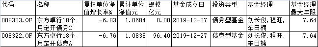 从东方卓行18个月定开债券二季报看,该基金资产净值中的85.4%持有中期票据,另有34.9%为企 业债,17.44%为金融债。二季度前五大债券为23湖南银行01、23东方债01BC、23济南高新MTN003、 23西证01、21青岛城投MTN004。截至今年6月30日,其规模合计为96.40亿元。 | 代码 | 名称 | 复权单位净 累计单位 规模 基金成立日 投资类型 | | 直我经典 | 真金经理 | | --- | --- | --- | --- | --- | --- | | | | 值增长率% 净值元 亿元 | | | 最大年限 | | 008323.0F 东方卓行18个 | | -6.83 1.0684 | 0.00 2019-12-27 债券型基金 刘长俊,程旺, | | 7.64 | | 月定开债券C | | | | 车日 楠 | | | 008322.0F 东方卓行18个 | | -6.76 | 1.0838 96.40 2019-12-27 债券型基金 刘长俊,程旺, | | 7.64 | | 月定开债券A | | | | 车目簡 | | 来源:同花顺 (责任编辑:康博) 中国经济网北京1 ...