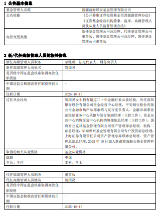 中国经济网北京10月15日讯今日,新疆前海联合基金管理有限公司公告,任命贺国灵为总经理、法定代 表人、财务负责人,并代任董事长。原总经理、法定代表人吴昱村因工作安排离任,原董事长黄炜离 任。邹文庆不再代履行公司总经理、法定代表人职责。 贺国灵历任洛阳银行股份有限公司资金经营中心经理,平安银行股份有限公司金融市场产品部承销与发 行室负责人、金融市场事业部经纪业务中心承销与发行室副经理(主持工作)、资金运营中心销售交易中 心机构销售部副总经理(主持工作),国海富兰克林基金管理有限公司资产管理部总经理、机构二部总经 理,华泰保兴基金管理有限公司专户投资部总经理,上海证券有限责任公司资产管理总部联席总经理、 资产管理总部总经理,2025年10月加入新疆前海联合基金管理有限公司。 | 基金管理人名称 | 新疆前海联合基金管理有限公司 | | --- | --- | | 公告依据 | 《公开募集正券投资基金信息技案管理办法》 | | | 《证券基金经营机构董事、监事、高级管理人 | | | 员及从业人员监督管理办法》 | | | 新任基金管理公司总经理、代任基金管理公司 | | 高管变更类型 | 董事长、离任基金管理公司 ...